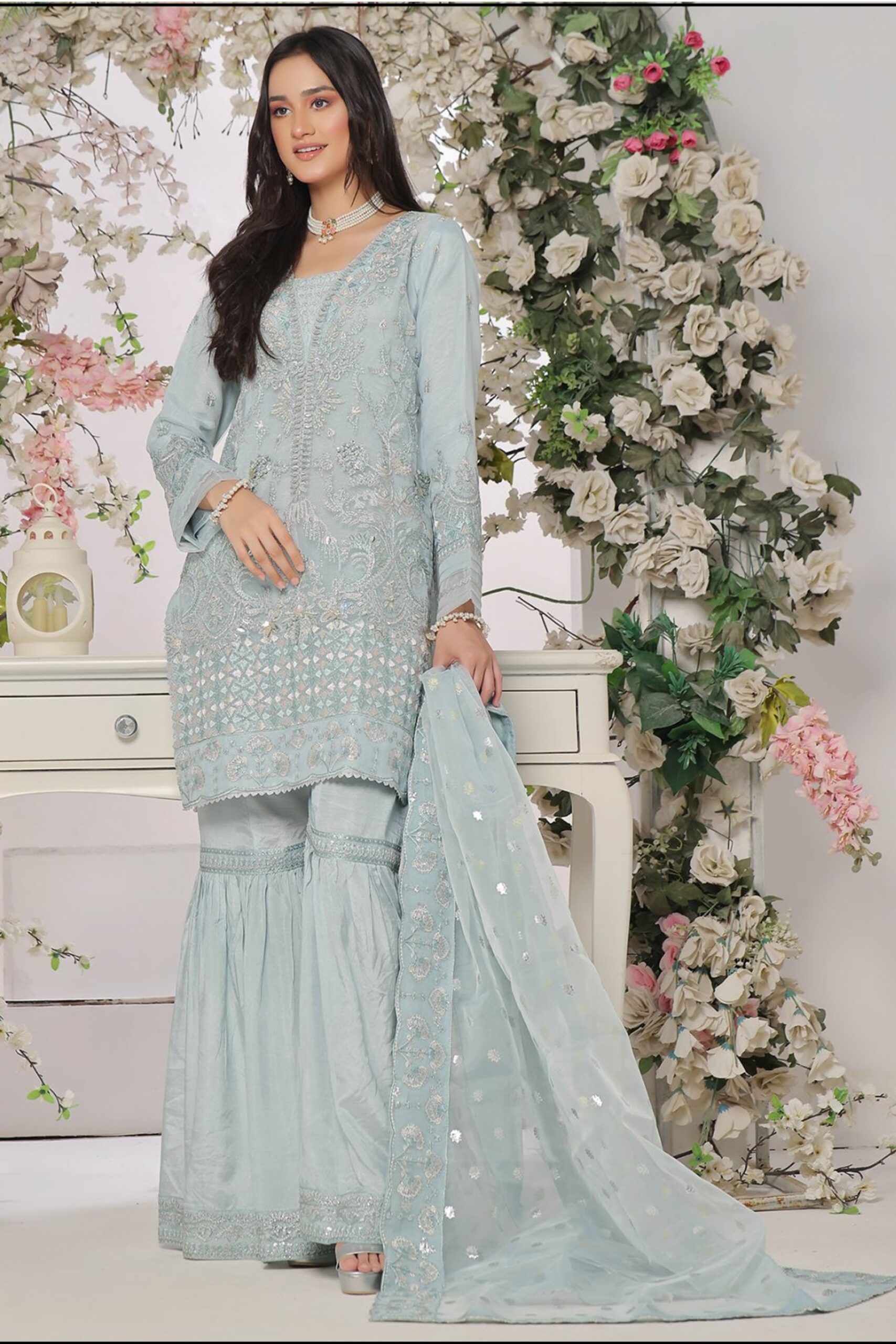 Add some glamour to your party wear collection with this enchanting unstitched set, created using beautiful organza fabric. This beautiful shirt has magnificent embroidery work, which gives it an elegant touch and paired well with an organza dupatta embellished with beautiful embroidered details.