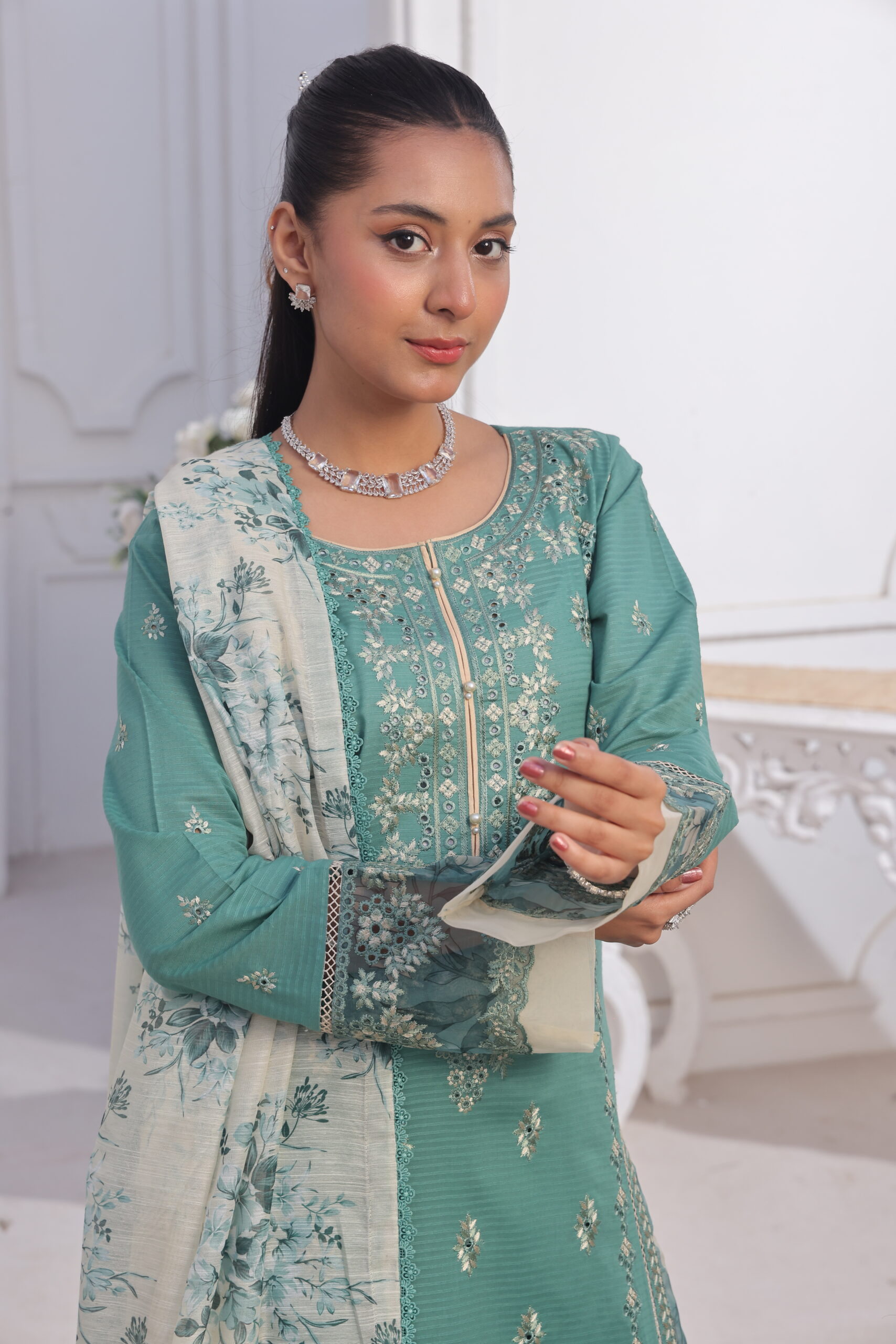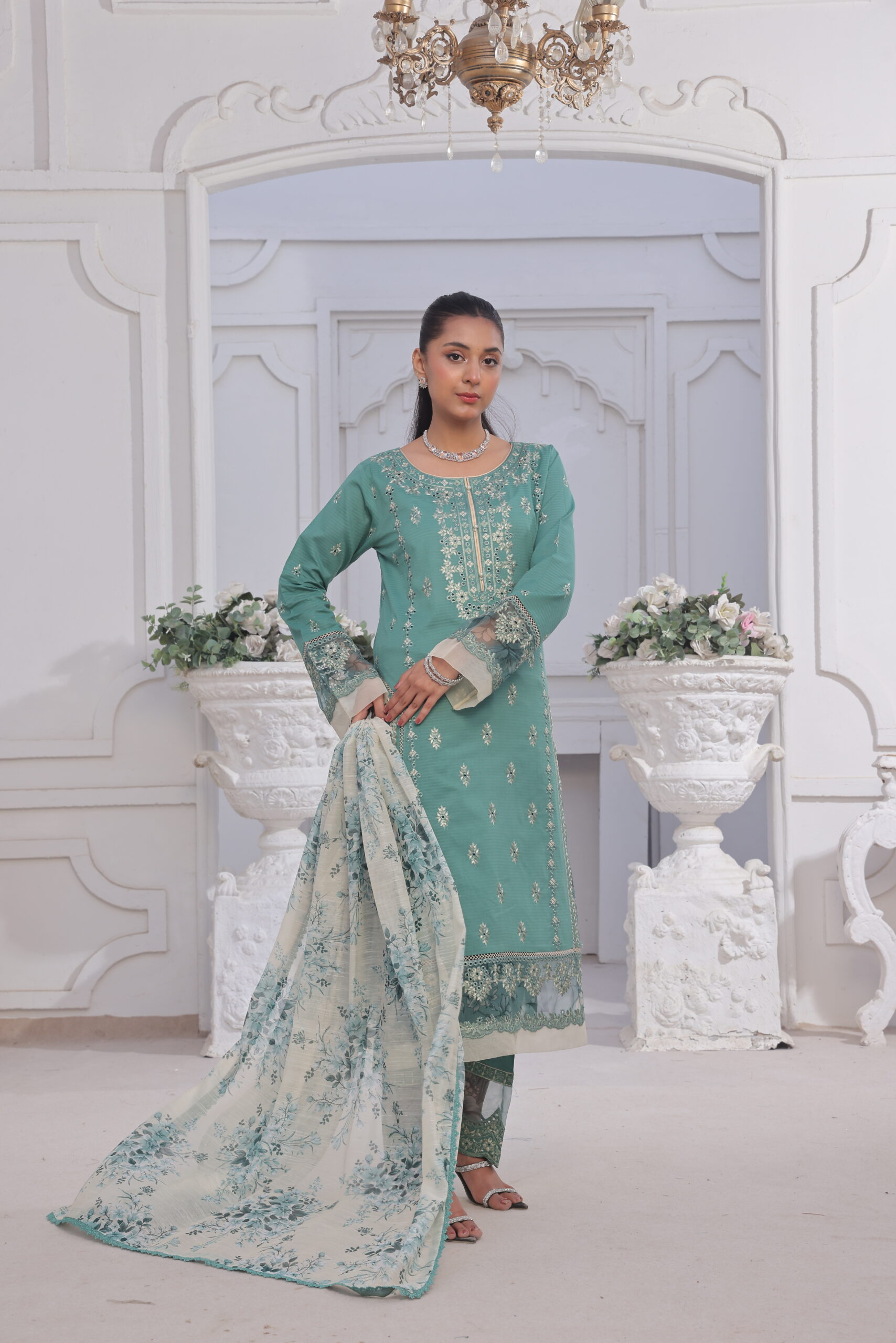 Let the elegance of a lifetime embrace you through the unstitched lawn collection in the mesmerizing color of mint teal. The lawn shirt in the collection has been beautifully adorned with some delicate embroidery motifs, giving it an elegance that touches the heart. The unstitched lawn collection has been completed with the cotton trouser that offers a perfect blend of comfort and elegance.