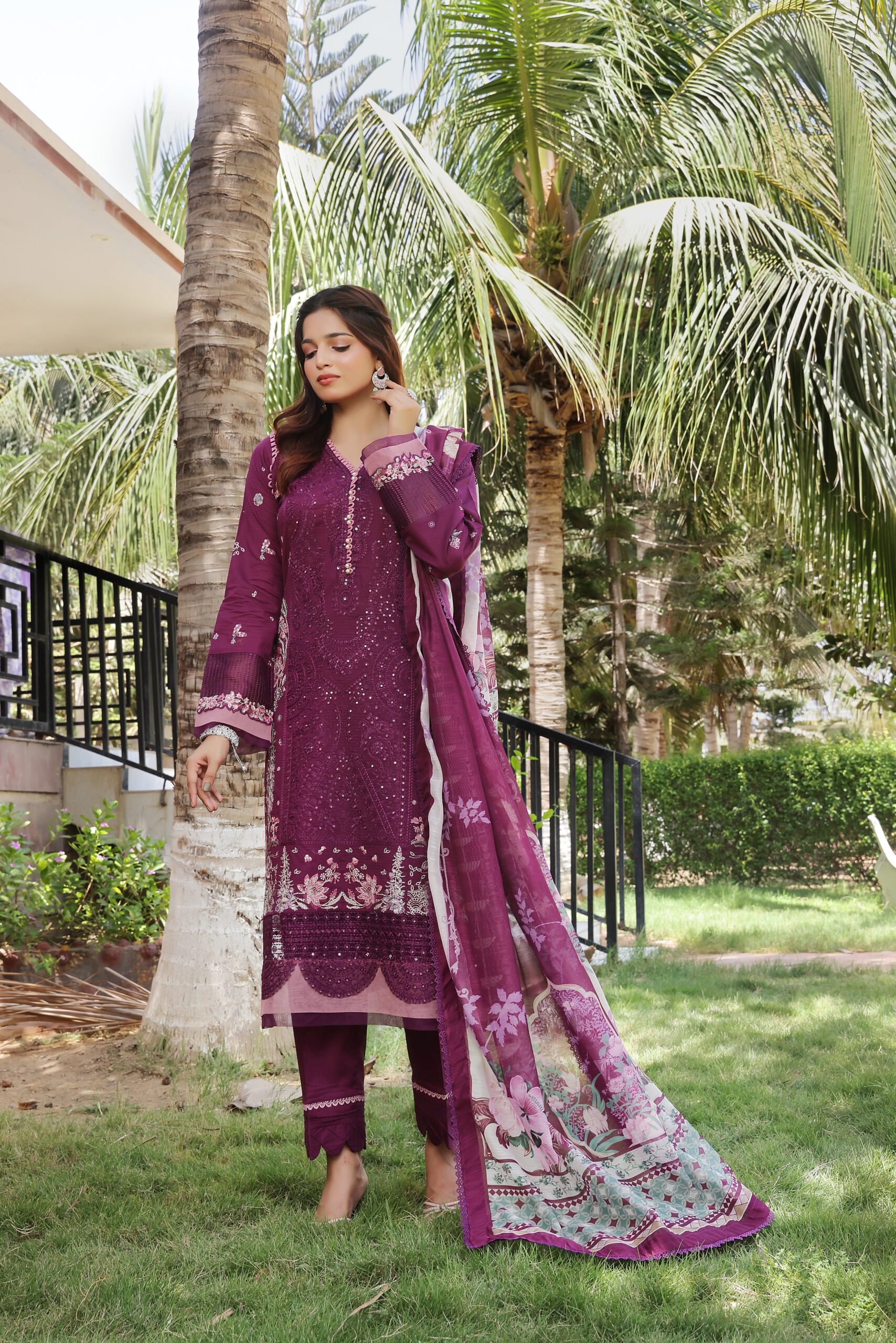 Enhance your seasonal wear collection with this luxurious unstitched lawn set, which has been designed in a gorgeous deep plum color. The lawn shirt has been adorned with an intricate embroidery pattern, entailing a minutely precise design detail that lends an element of elegance and sophistication. This complete look has been teamed up with a stunningly coordinated lawn dupatta, designing a classic look with complementing prints and border work. The lawn trousser completes the look, offering both comfort and versatility.