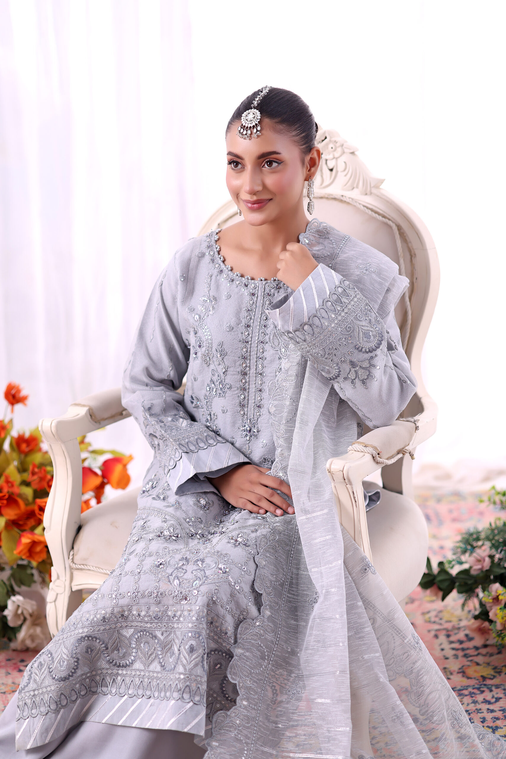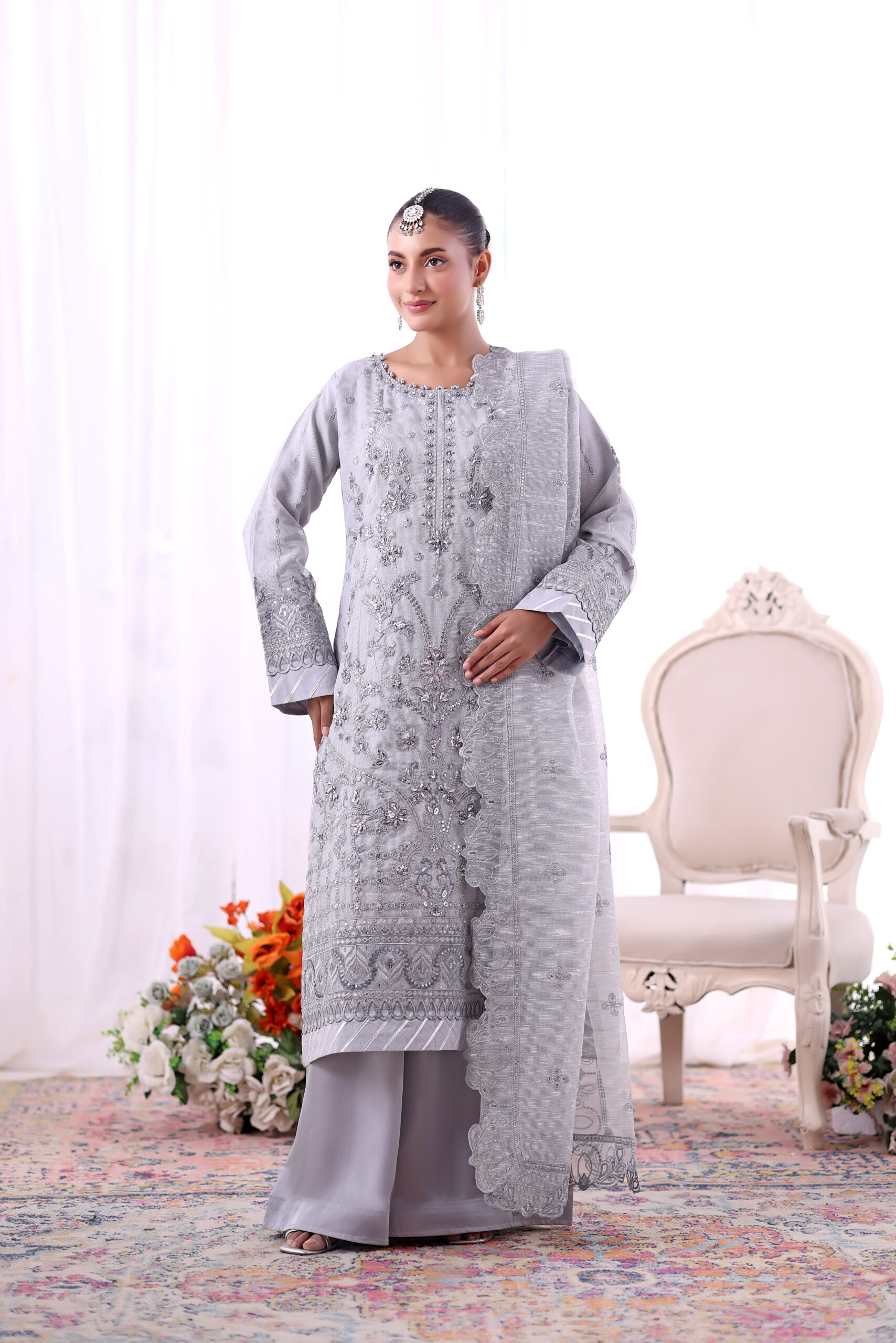 This beautiful un-stitched set is made from top-class organza material, which gives it a light and breezy effect. The organza shirt has beautiful embroidery work, which adds to its elegance, while the organza dupatta gives it a soft, flowing effect. The combination of the organza shirt, organza trousers, and organza dupatta creates a set that exudes elegance and finesse.