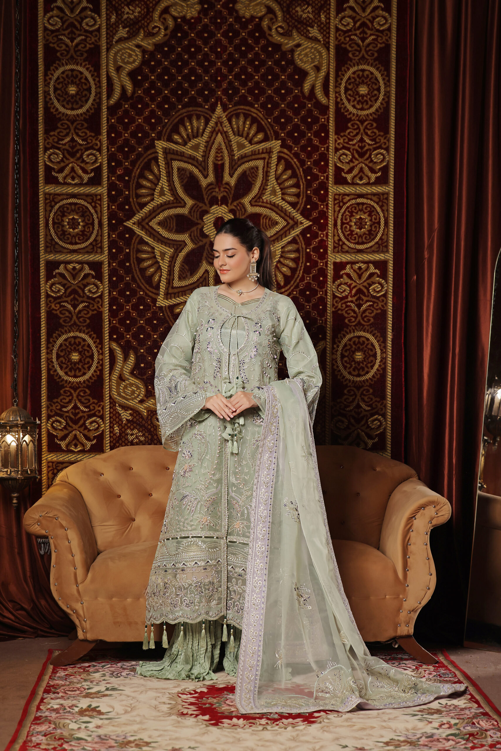 Indulge in the essence of timeless elegance with this outstanding sage green unstitched suit that symbolizes the incorporation of refined luxury and classic elements. The organza shirt comes with intricate designs of embroidered flowers and patterns that are skillfully placed all over the shirt, from the chest to the sleeves and them. The intricate detail on the neckline, accompanied by tassels, adds to the classic touch.