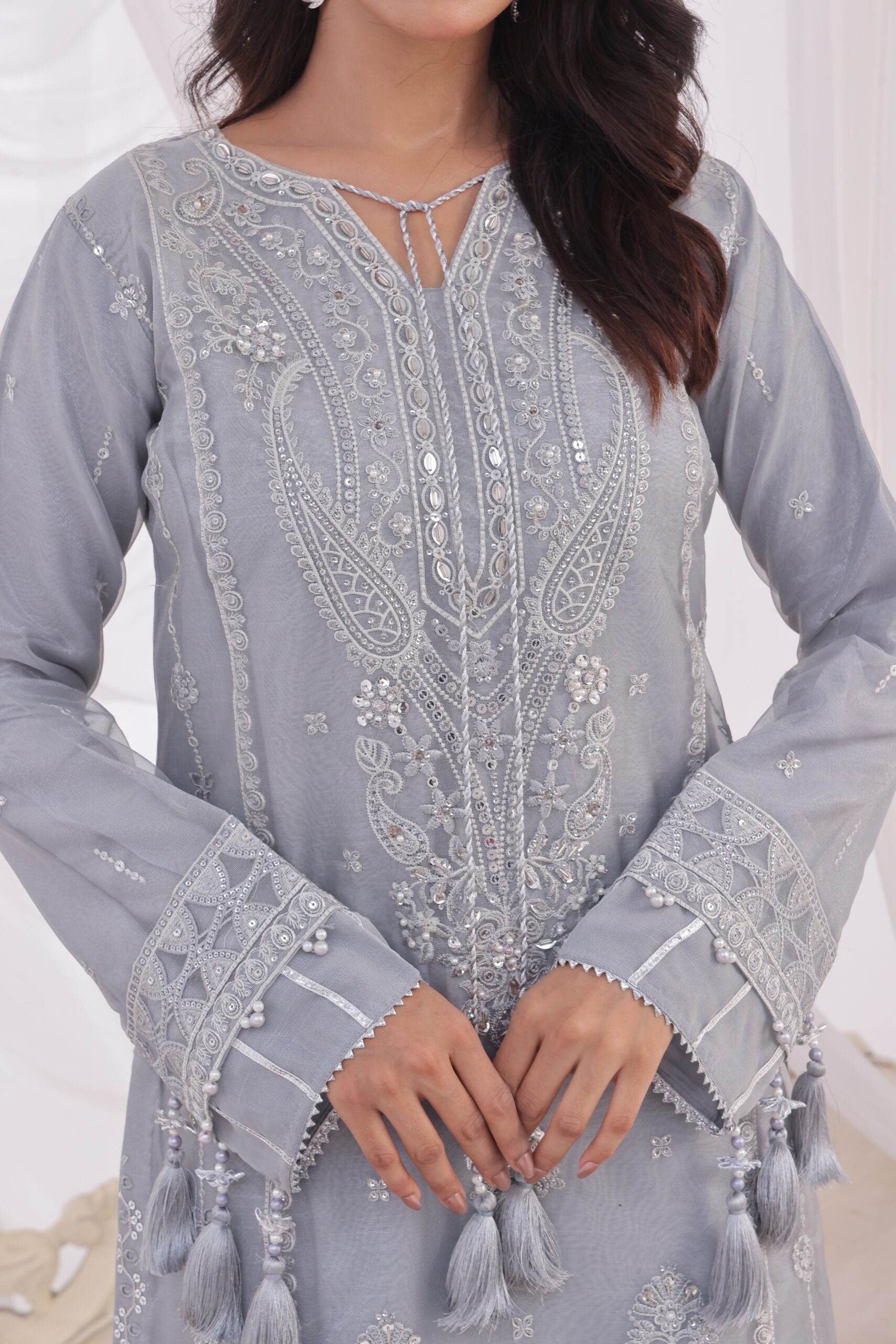 Well-crafted and modern, this steel grey unstitched suit is designed to create effortless style .The suit is paired with a silky shirt made of the finest silk fabric, heavily embroidered with delicate sequin details, giving it a classy and sparkling effect. This light grey hue is perfect and trendy, giving it a chic and timeless touch.