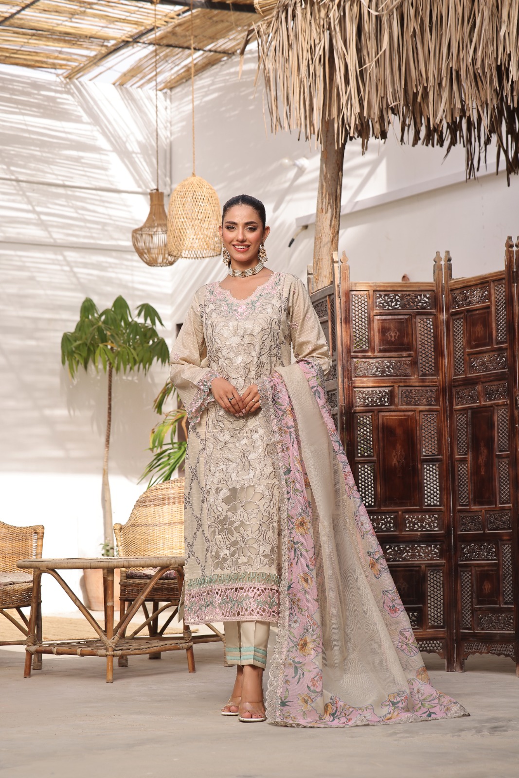 Paired up with a complementing lawn dupatta, it contains minute detailing of flowers. This outfit screams understated sophistication. The matching lawn pants complete the look, making sure comfort is not compromised on elegance. It comes in unstitched format, hence it can be stitched to your desired fitting and style. It’s ideal for festive wear, daytime gatherings, and seasonal celebrations.