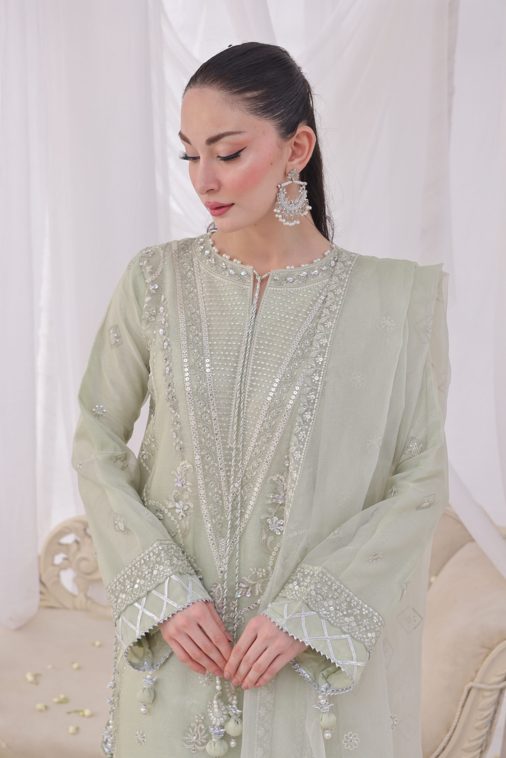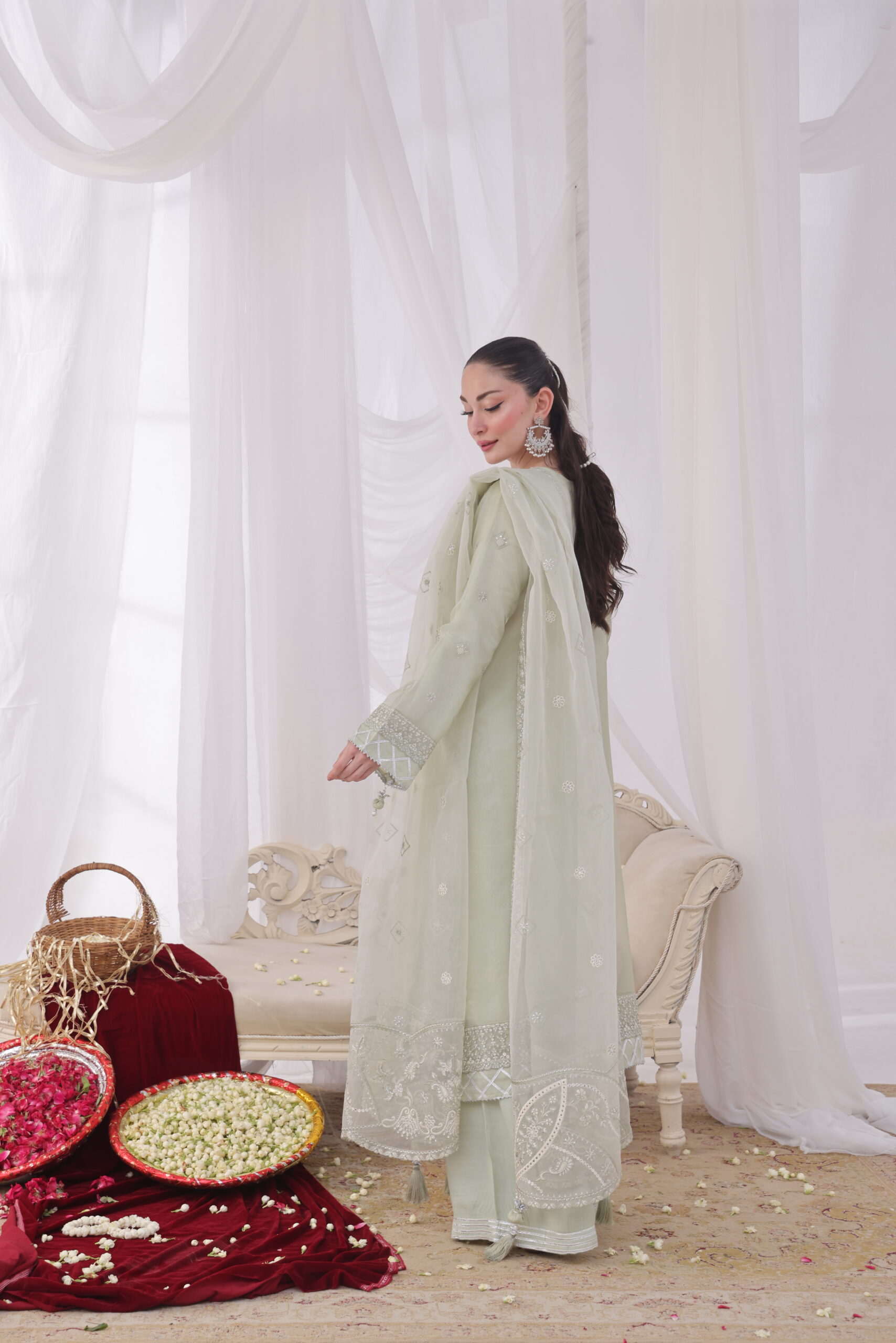 Teamed with a lightweight silk dupatta featuring scattered embroidery work and elegant border details, this outfit promises a sleek and flowy fabric drape. The matching trousers are crafted using raw silk viscose fabric, giving them a comfortable yet subtle shine that blends perfectly with the silk fabric.