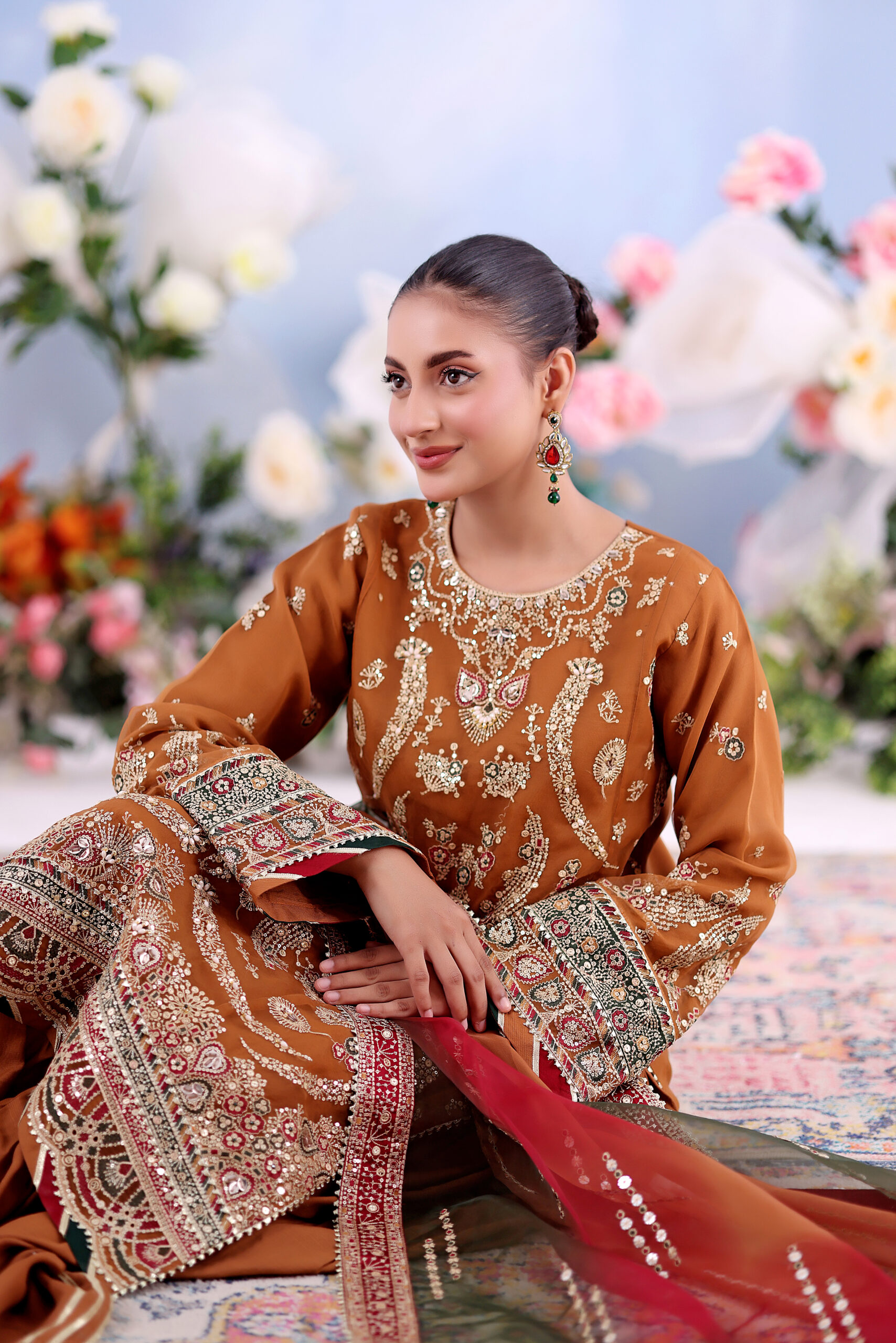 Elevate your festive collection with this beautifully crafted unstitched set, designed to capture the essence of elegance and grace. The shirt and dupatta are crafted from high-quality organza fabric, paired with beautiful embroidery work that perfectly accentuates the rich earthy tone. The light organza dupatta is designed with fine details and a beautiful fall, giving it a sophisticated touch. Team it with a matching organza trouser, and this set provides a complete elegant look that is perfect for formal and semi-formal events.
