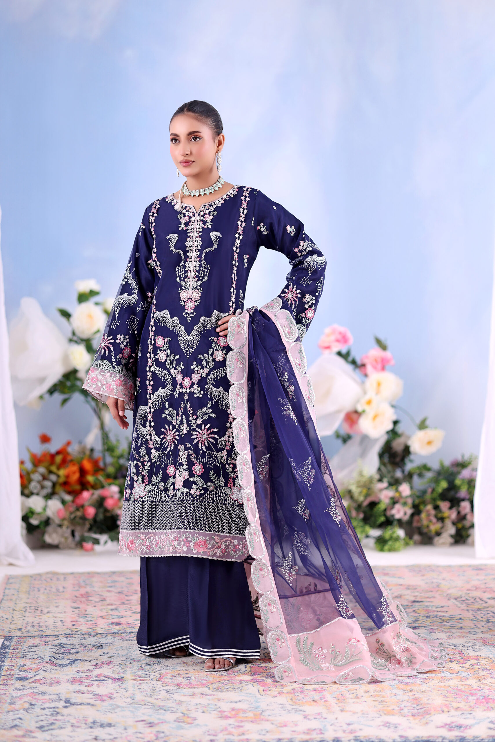 Navy Blossom Embroidered Organza Unstitched Suit