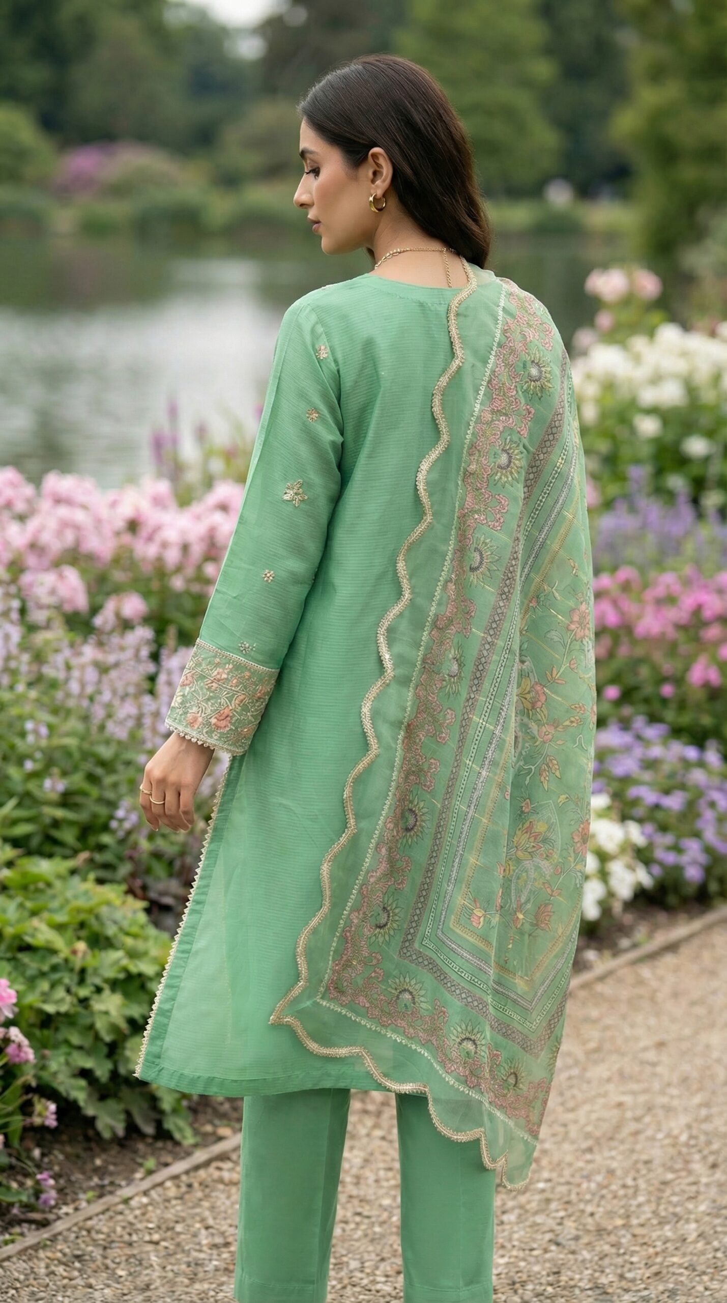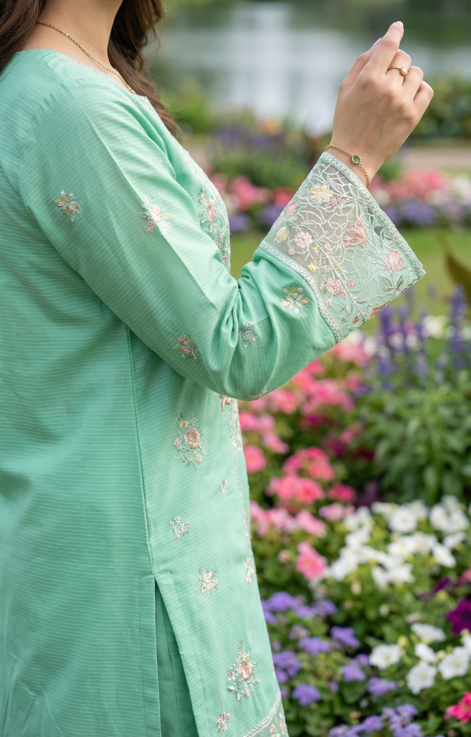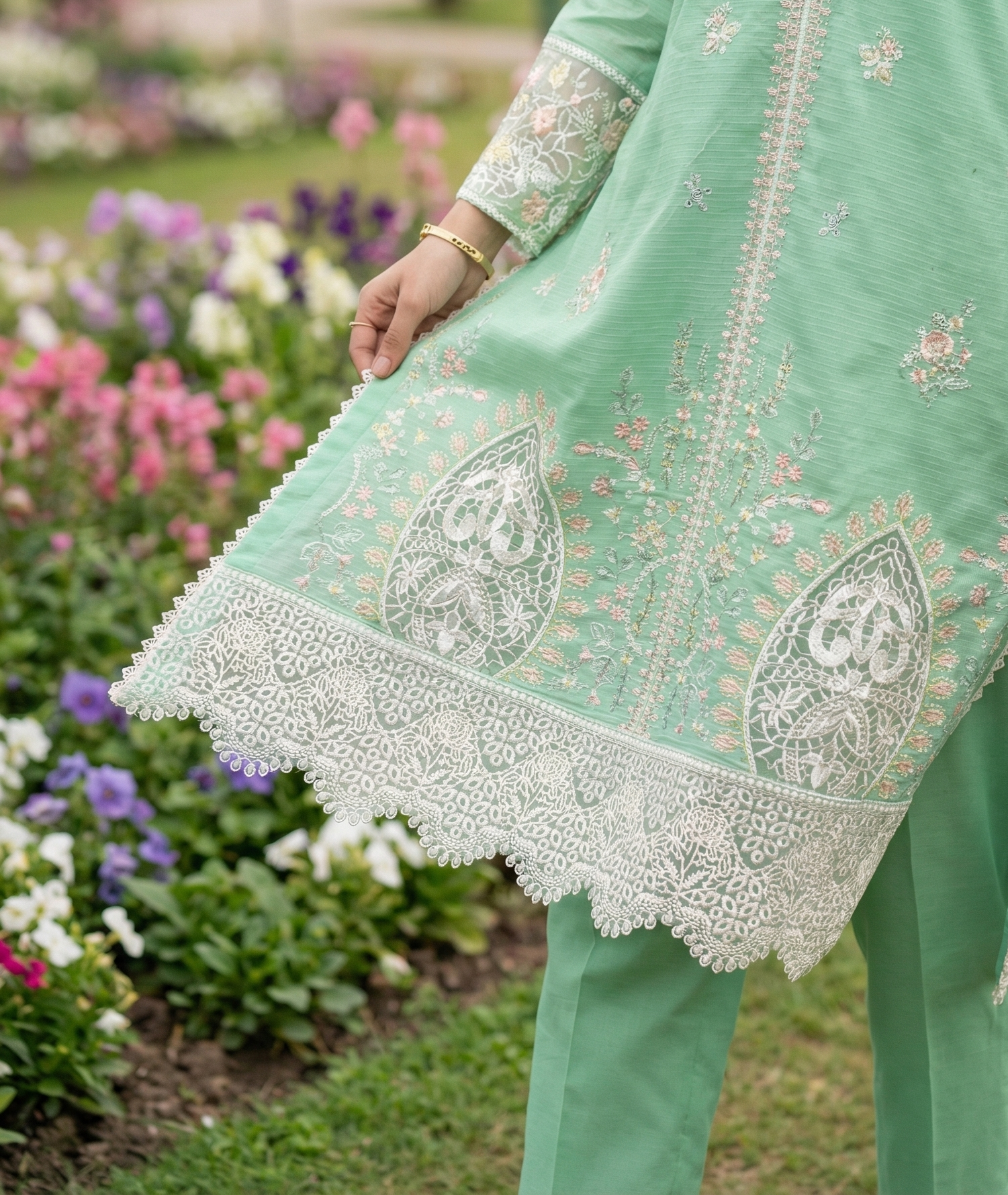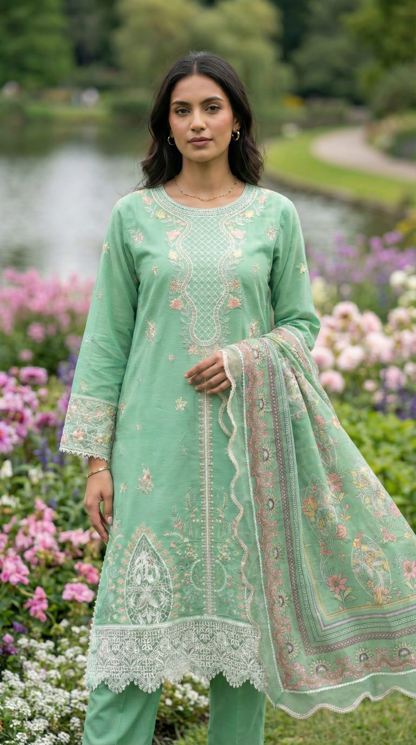 Update your summer collection with this stylish mint green unstitched lawn suit set, which will be just right for you to give a perfect combination of comfort and elegance. This beautiful shirt is made of high-quality lawn material with an elegant design, and it features amazing embroidery details that add grace and beauty to its cool tone.