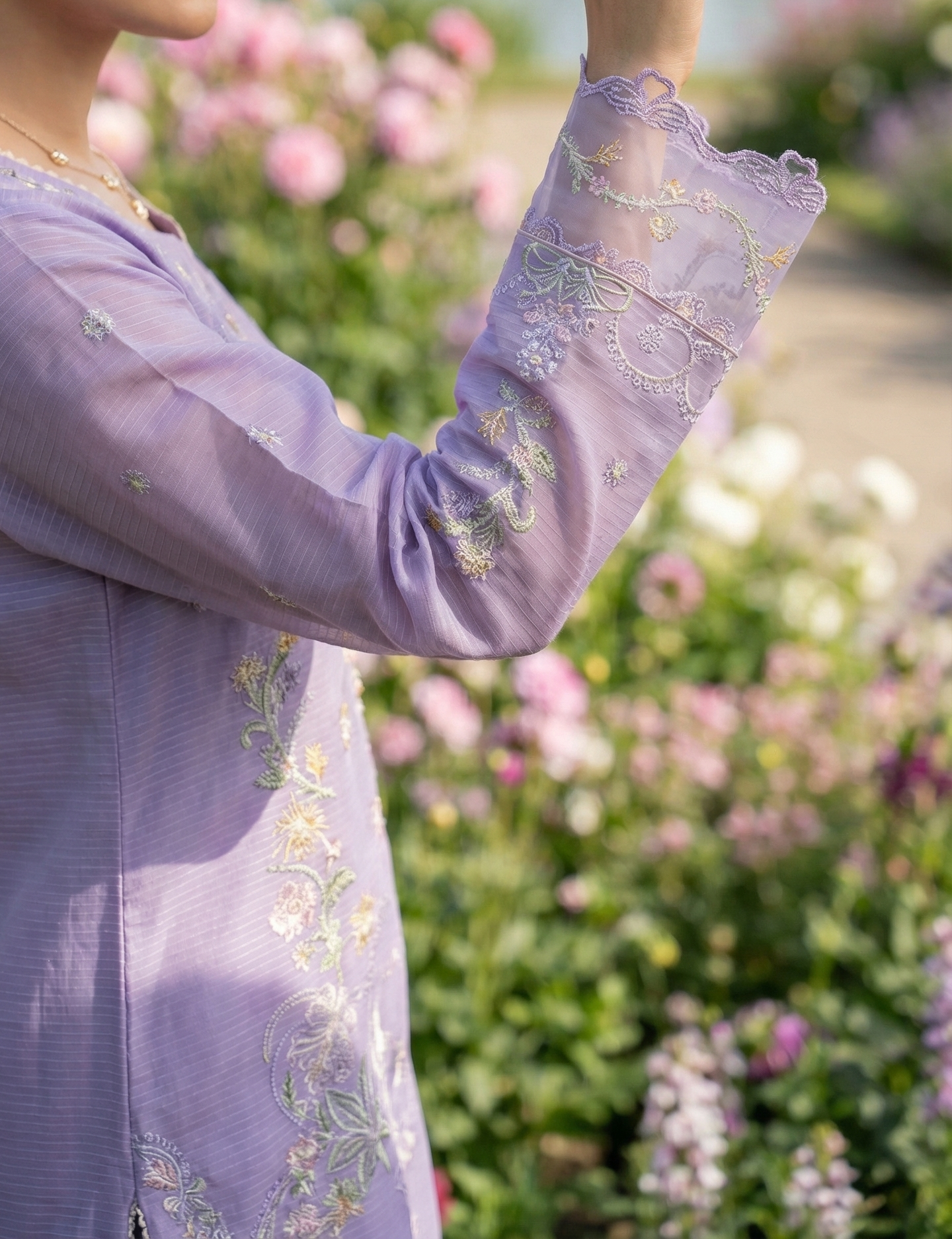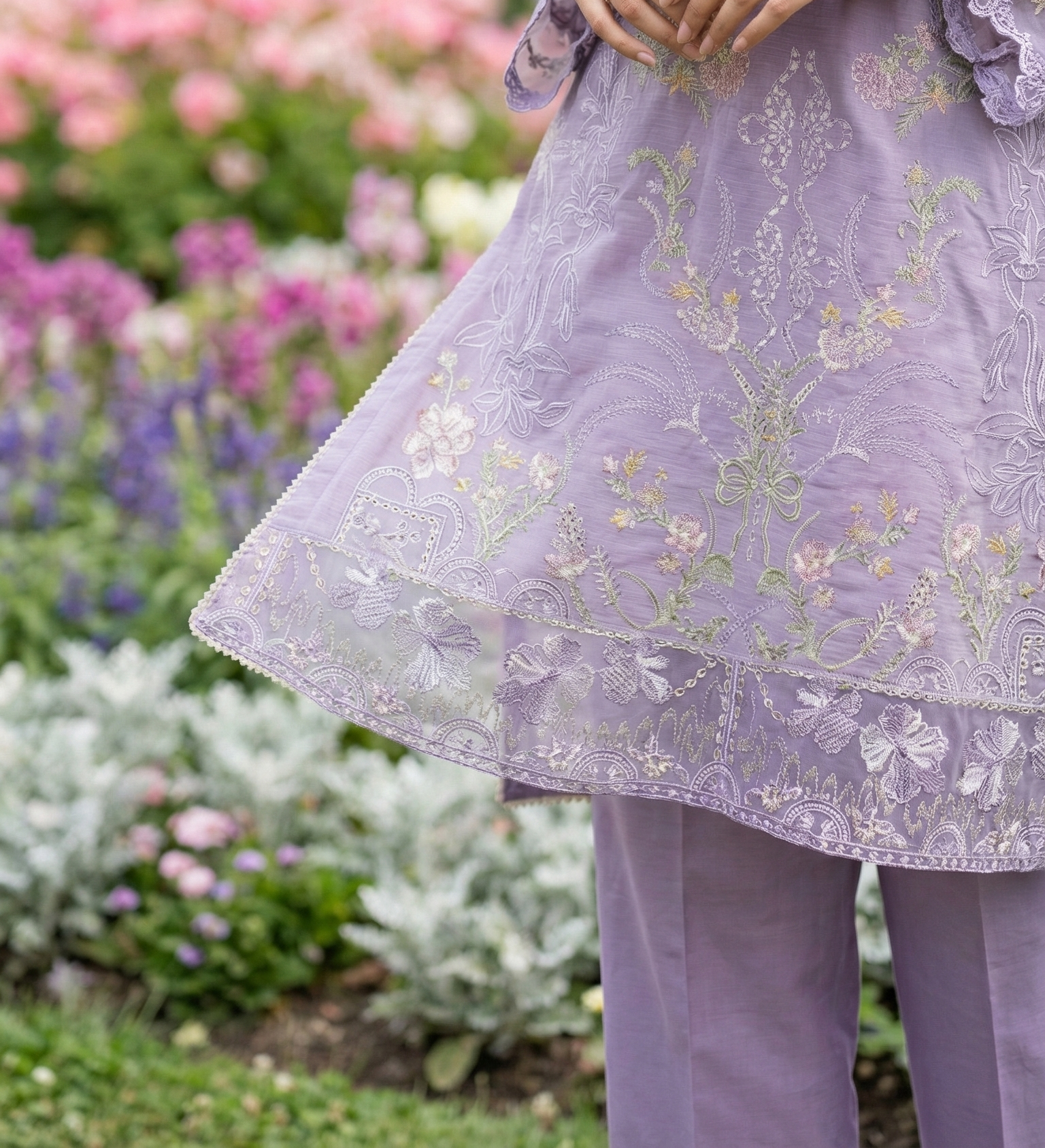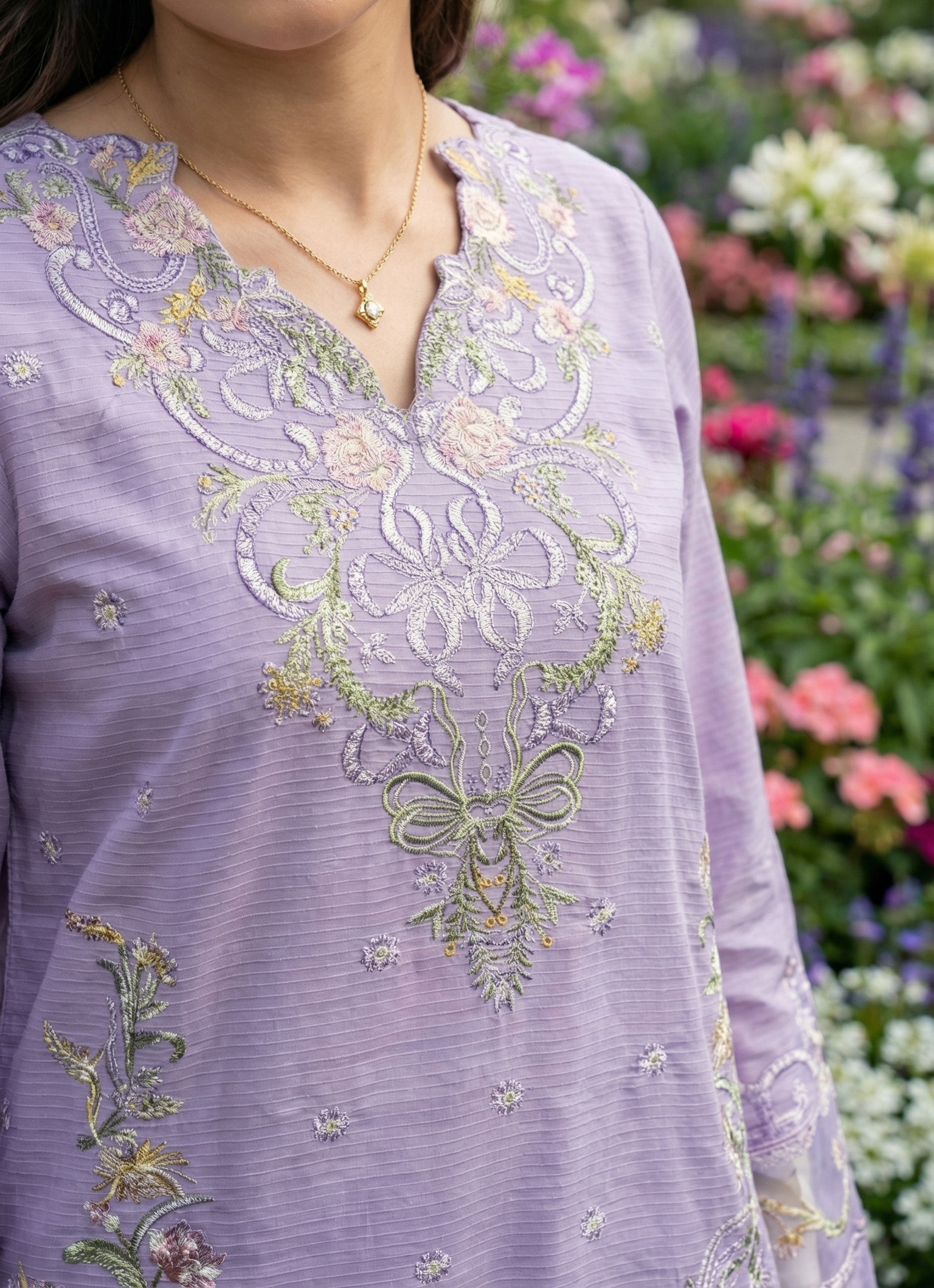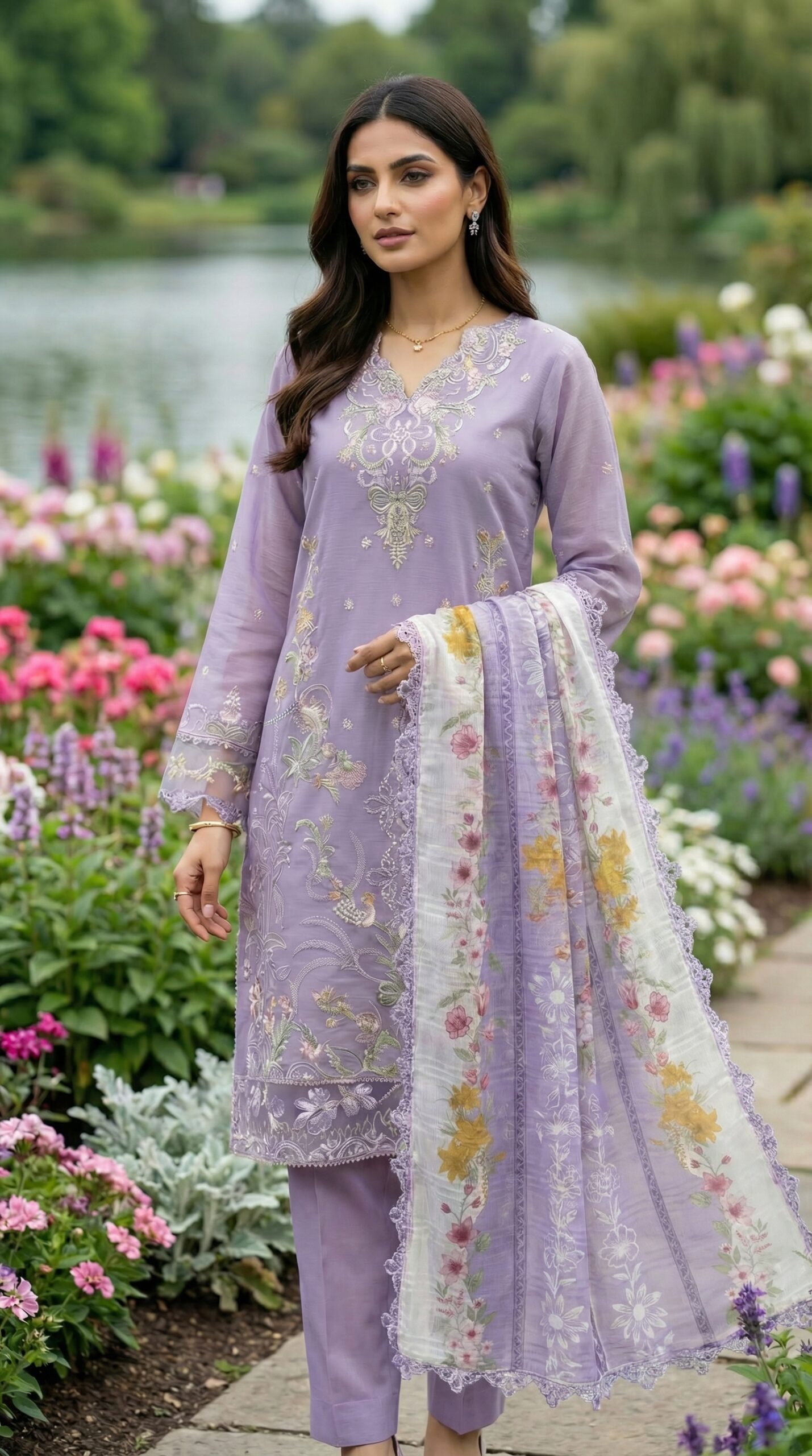 Experience the elegance of femininity by wearing this lovely lavender unstitched lawn suit which gives you a balanced combination of beauty and comfort. The shirt has been made using high-quality lawn fabric and features attractive embroidery work along with lovely floral prints all over the blouse, sleeves, and bottom.