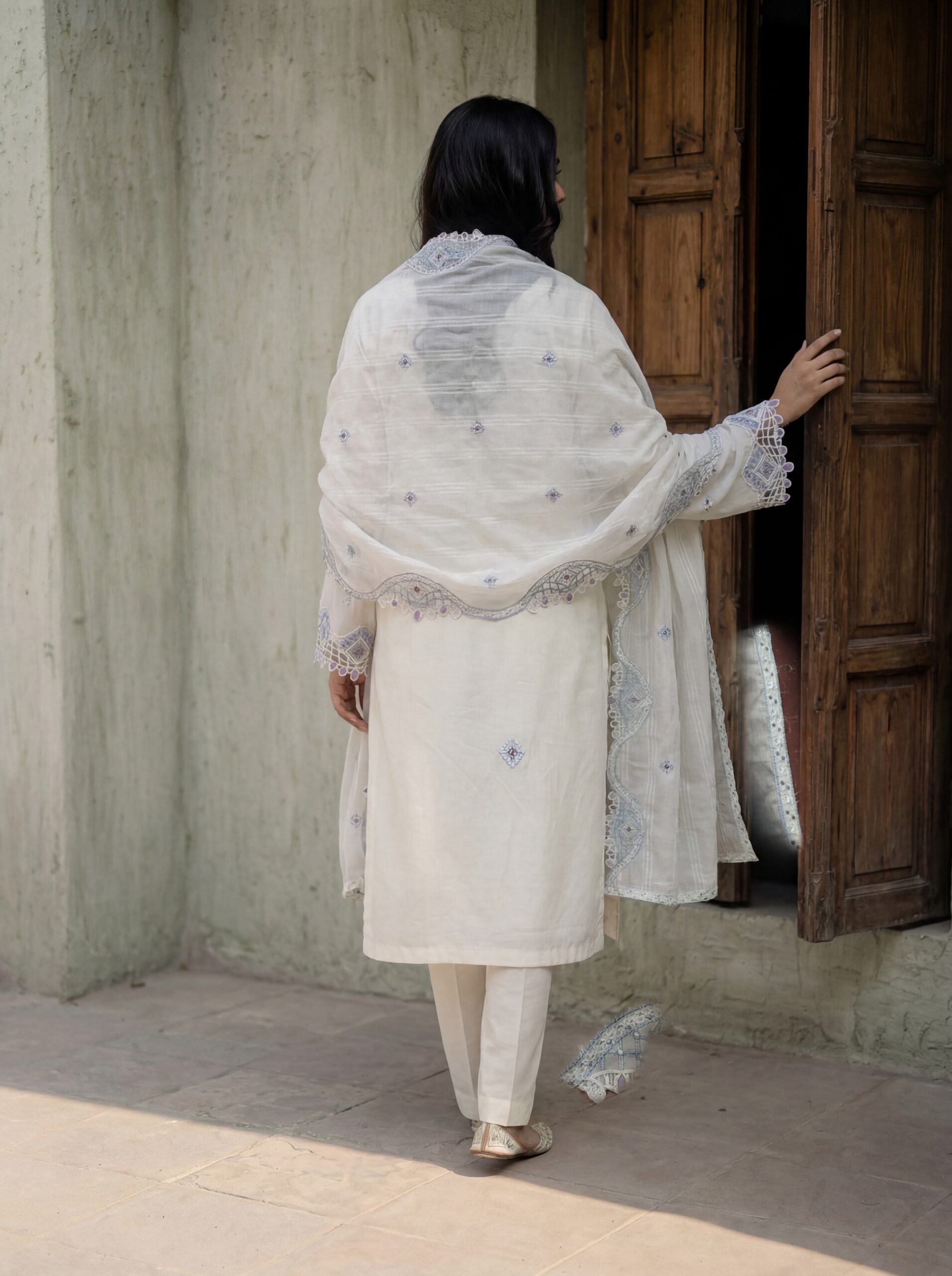 The ensemble is accompanied by a matching pair of cotton trouser, offering comfort and ease for casual wear. This ensemble is completed with a beautifully crafted munar dupatta, featuring delicate designs and sophisticated borders for an effortless look of elegance.