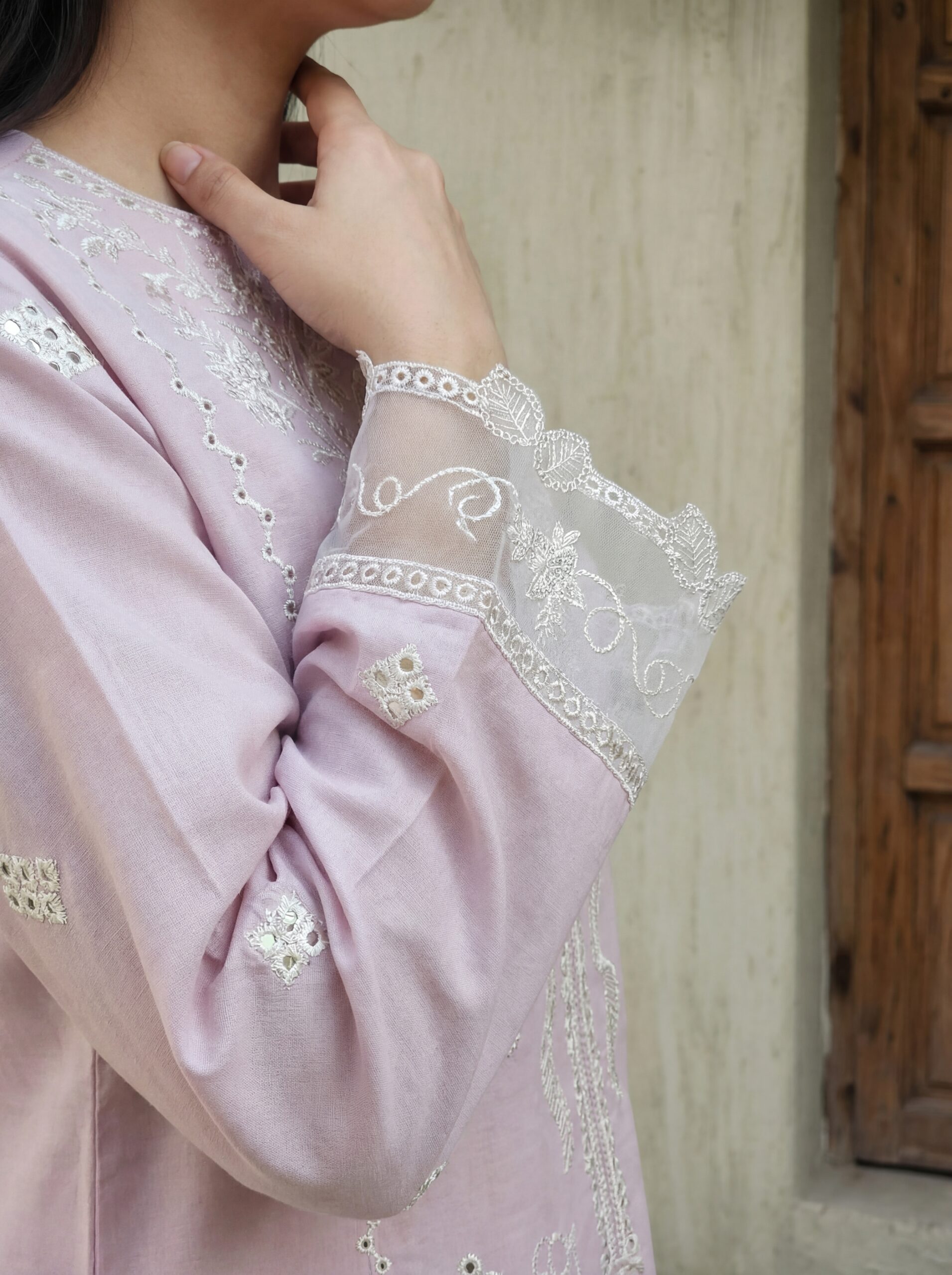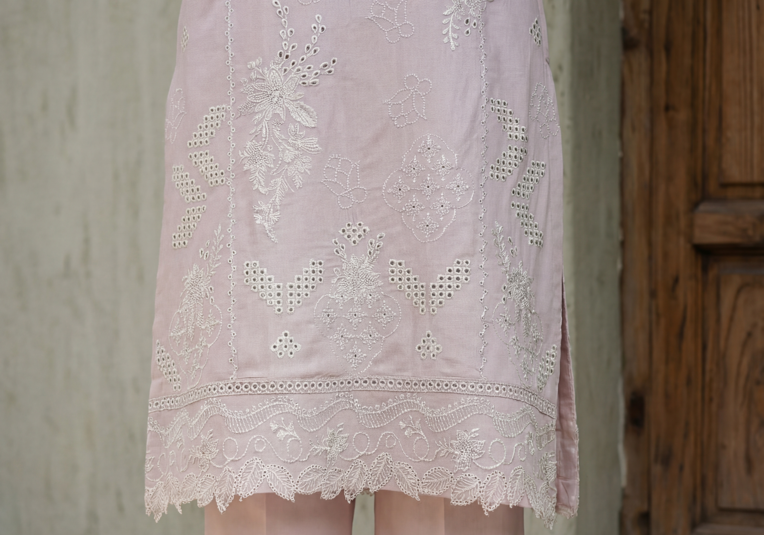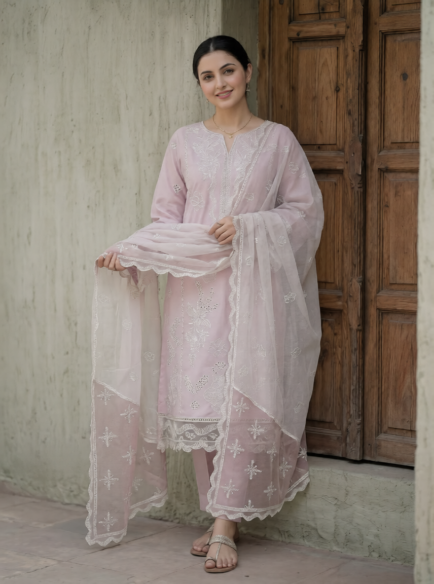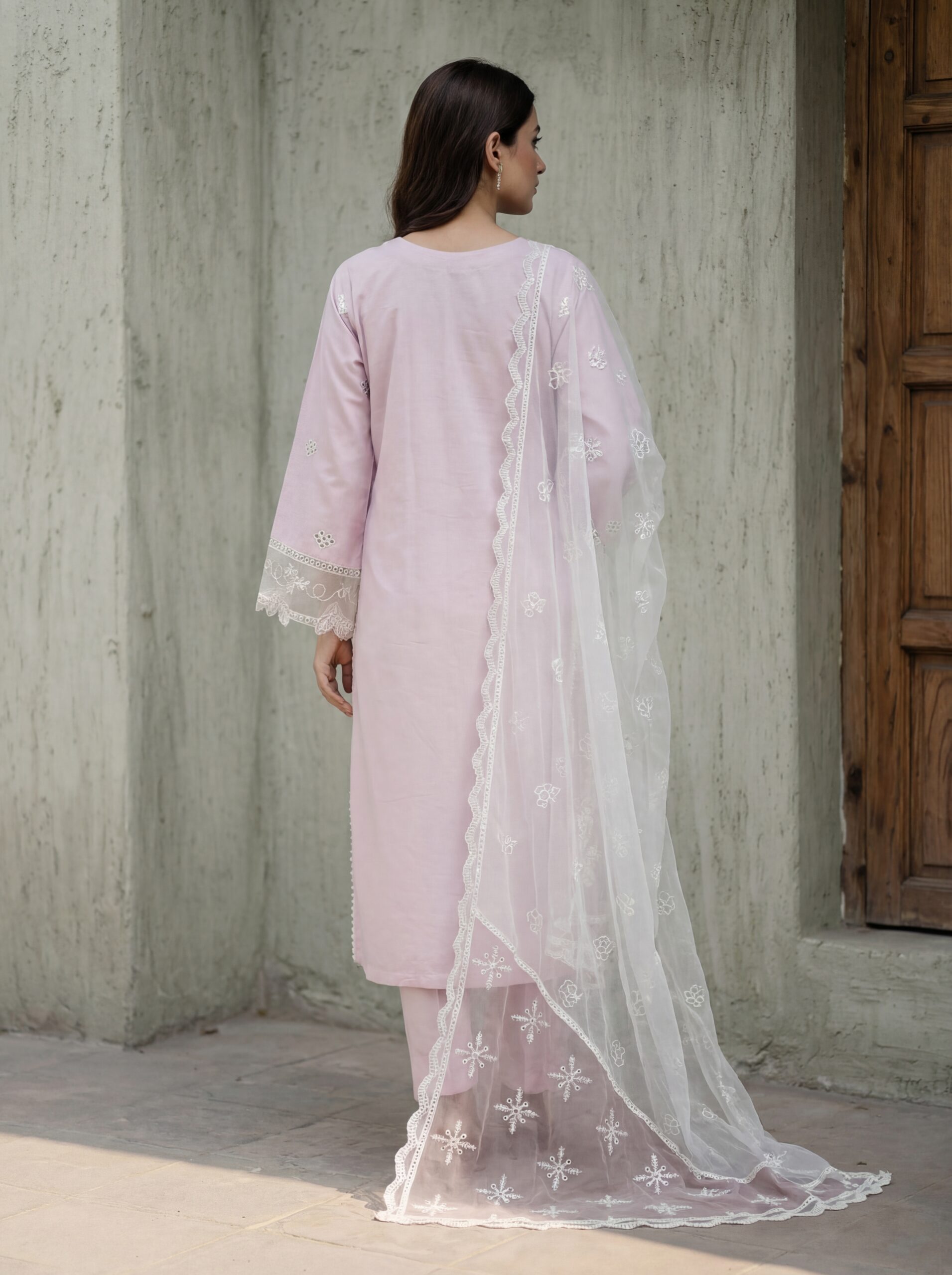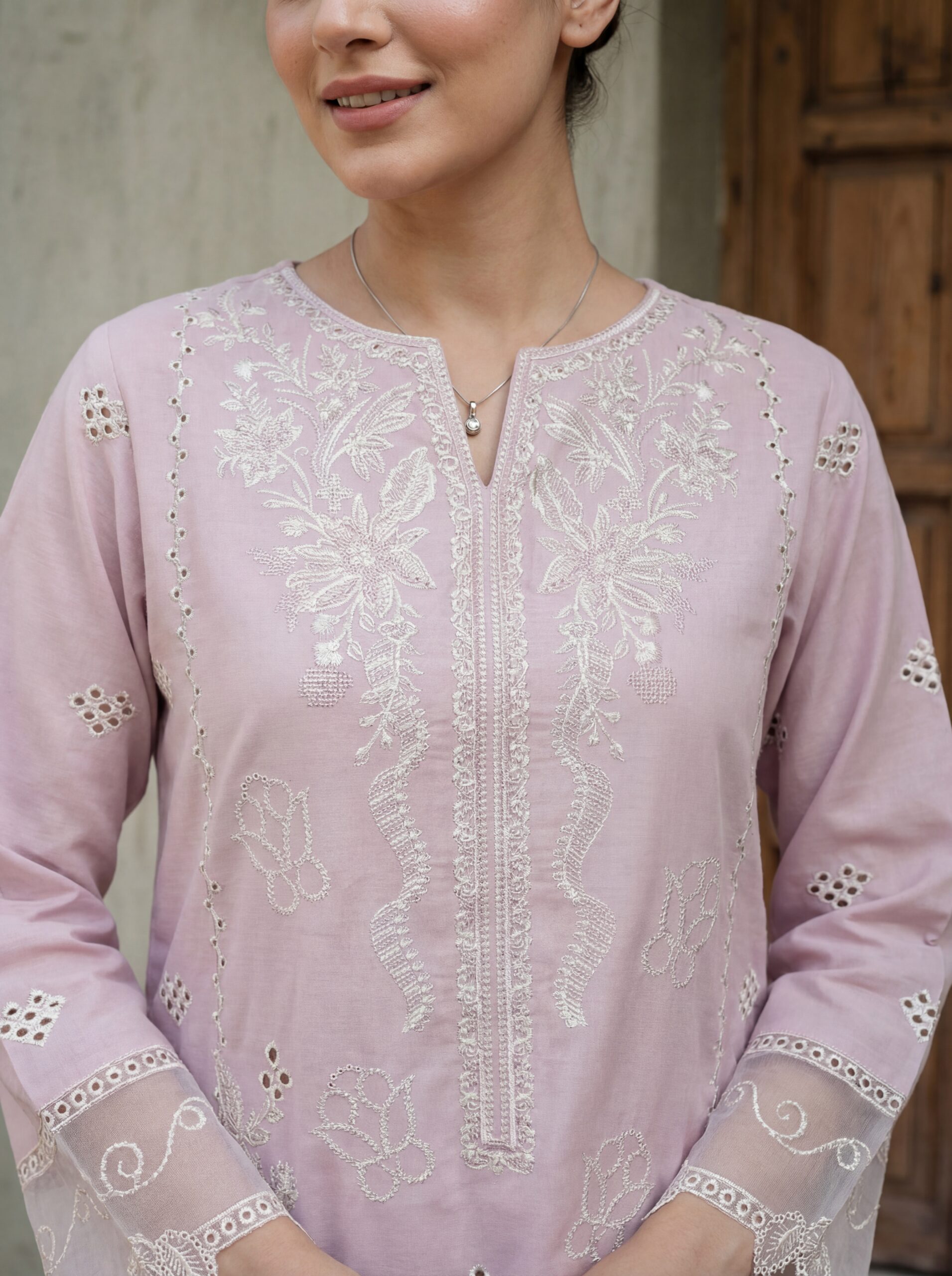 Elevate your everyday style with this beautifully crafted blush mauve ensemble, created with delicate white embroidery that brings a touch of timeless elegance. The shirt is crafted with the finest lawn material, which boasts intricate designs that bring out the beauty of the material’s soft and elegant look. The matching munar dupatta with delicate designs brings a light and airy feel to the outfit, ideal for the warmer days.