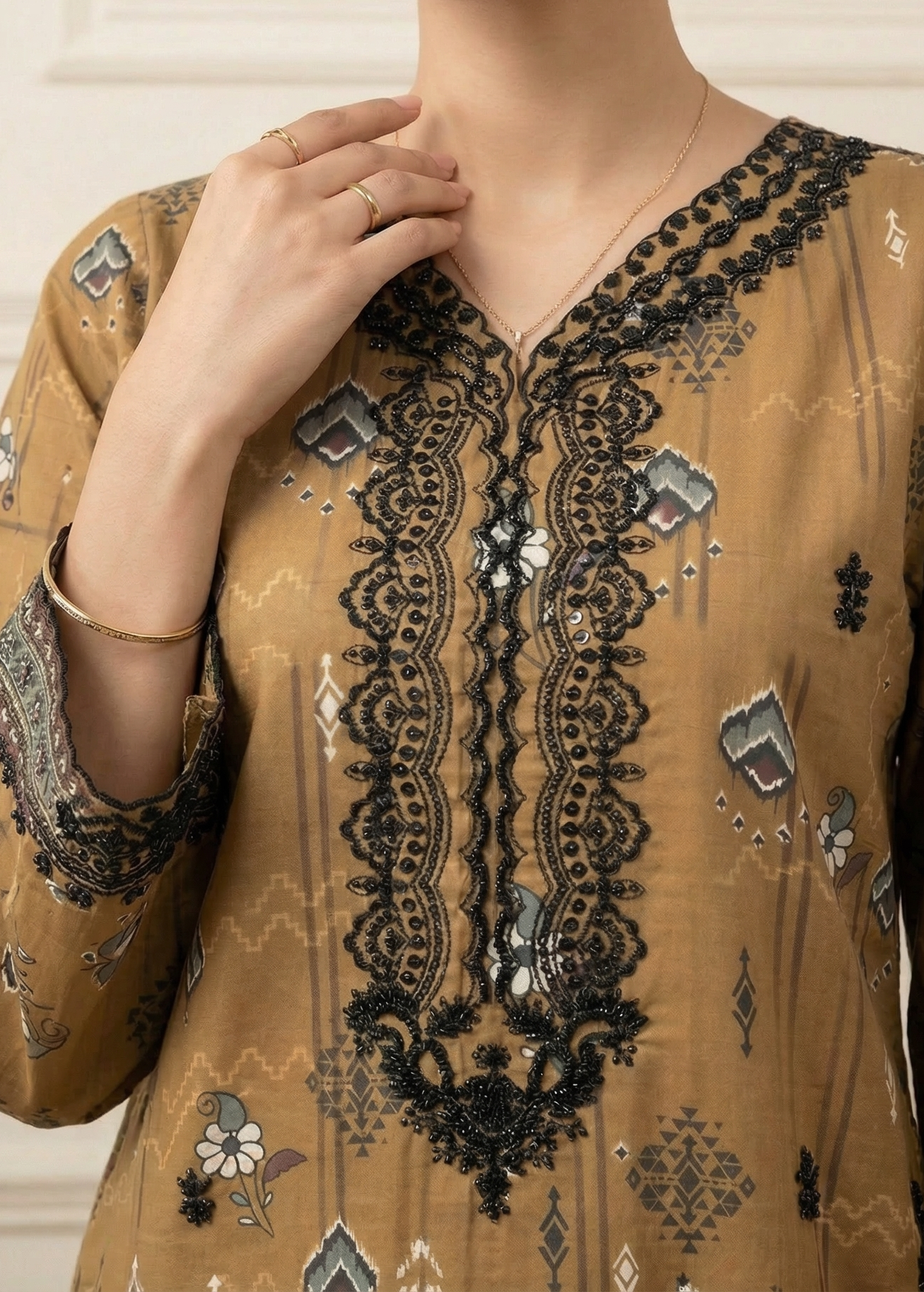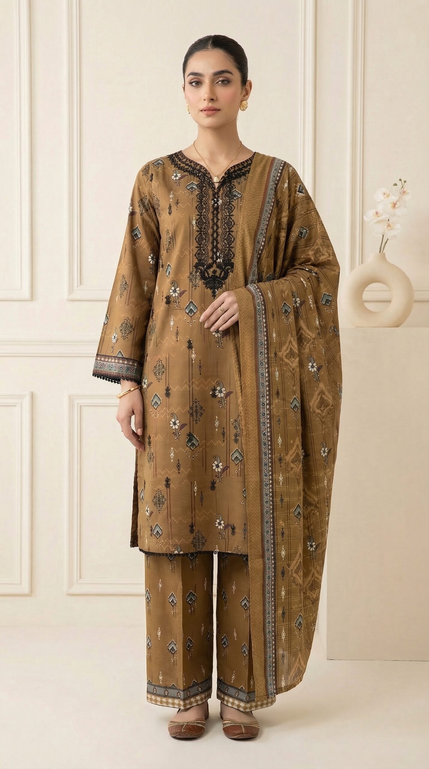 Brown Mustard Embroidered Lawn Unstitched Suit