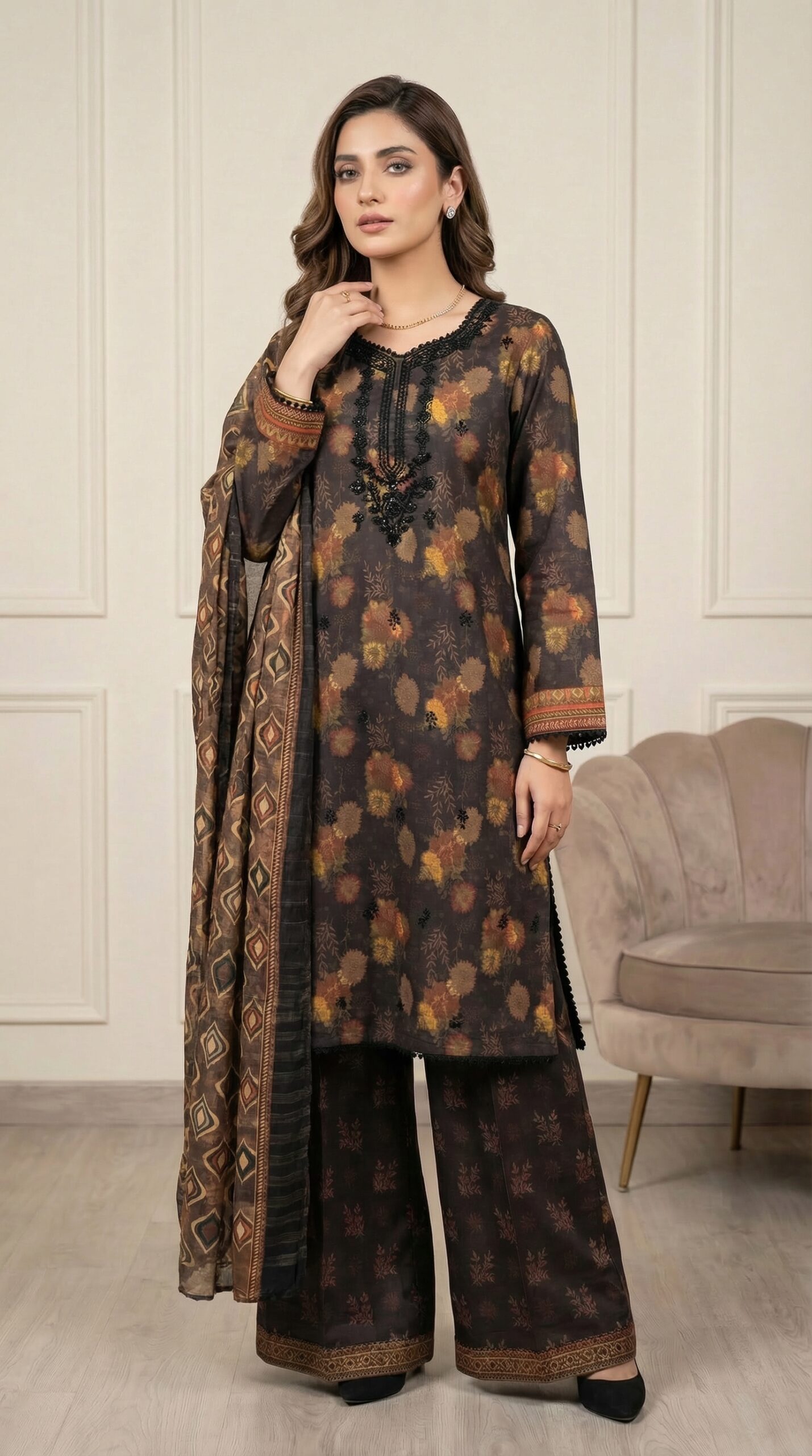 Dark Brown Floral Embroidered Lawn Unstitched Suit