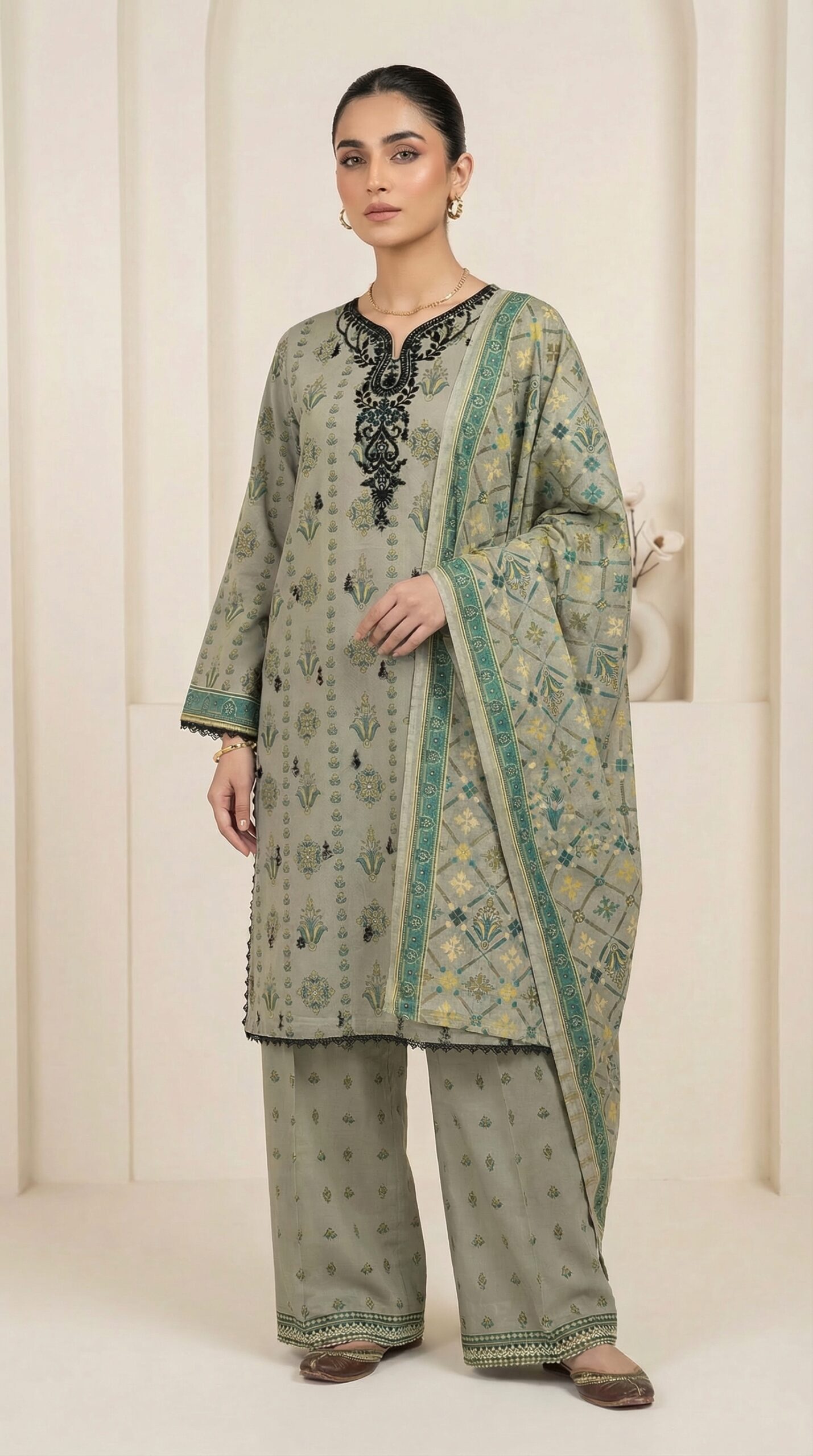 Muted Olive Floral Embroidered Lawn Unstitched Suit