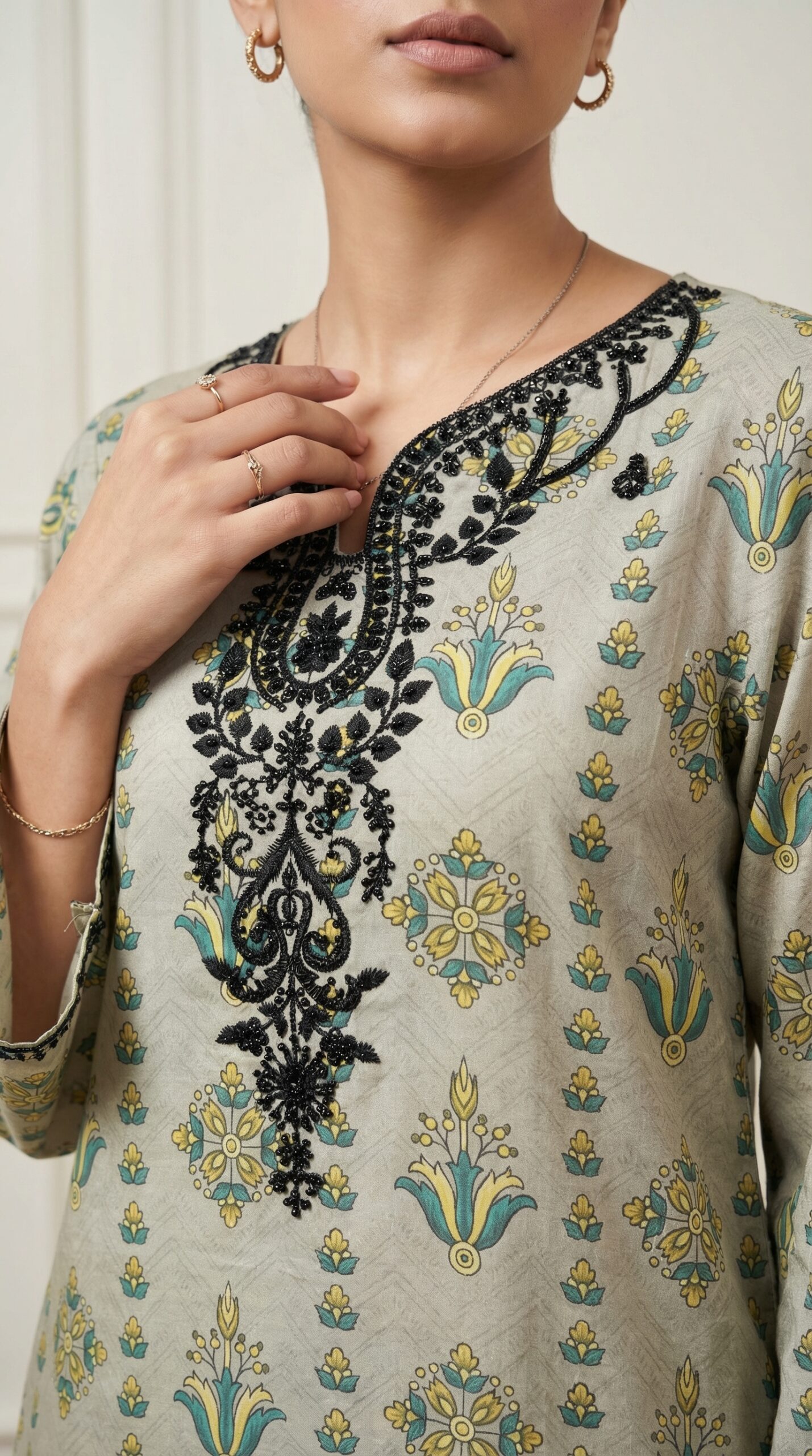 The outfit is completed by the beautifully coordinated lawn dupatta, giving the entire look an elegant and fluid touch. The outfit comes with cotton trouser fabric, giving you the complete look and making it ideal for daily wear and casual gatherings.