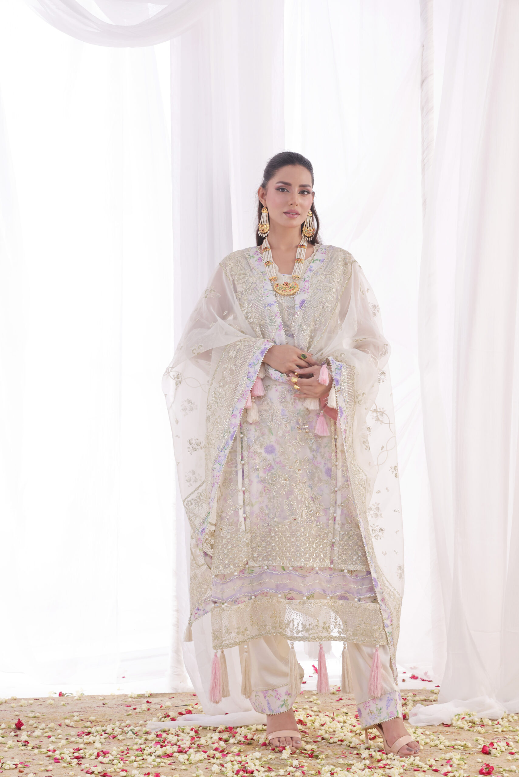 The overall is completed with an organza trouser, offering a cohesive and graceful silhouette. This unstitched set allows you the freedom to tail it according to your liking and is perfect for formal gatherings, festivities, and special celebrations.