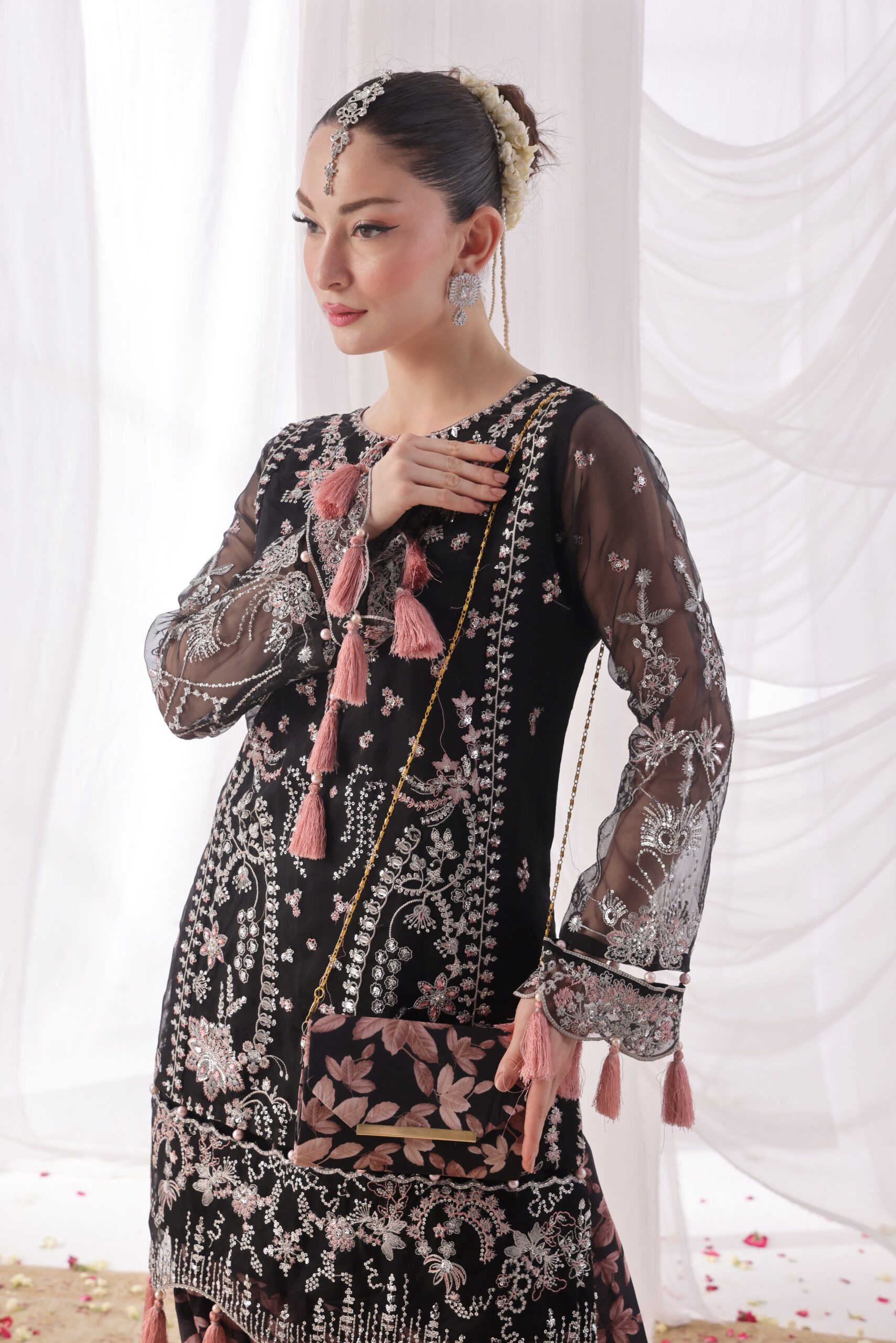 Make a statement of eternal chic with this beautiful three-piece unstitched organza attire. The beauty of organza shirt is embellished with intricate embroideries and fine detailings that exude richness, making it apt for festive and formal wear. Accompanied by an organza dupatta in sheer with delicate embellishments with an elegant border, this outfit speaks volumes for grace and opulence. Matched with the organza trouser to complete the set, it presents you with a coordinating yet refined finish. As an unstitched outfit, it allows you to create the silhouette that fits your desired style and fit.